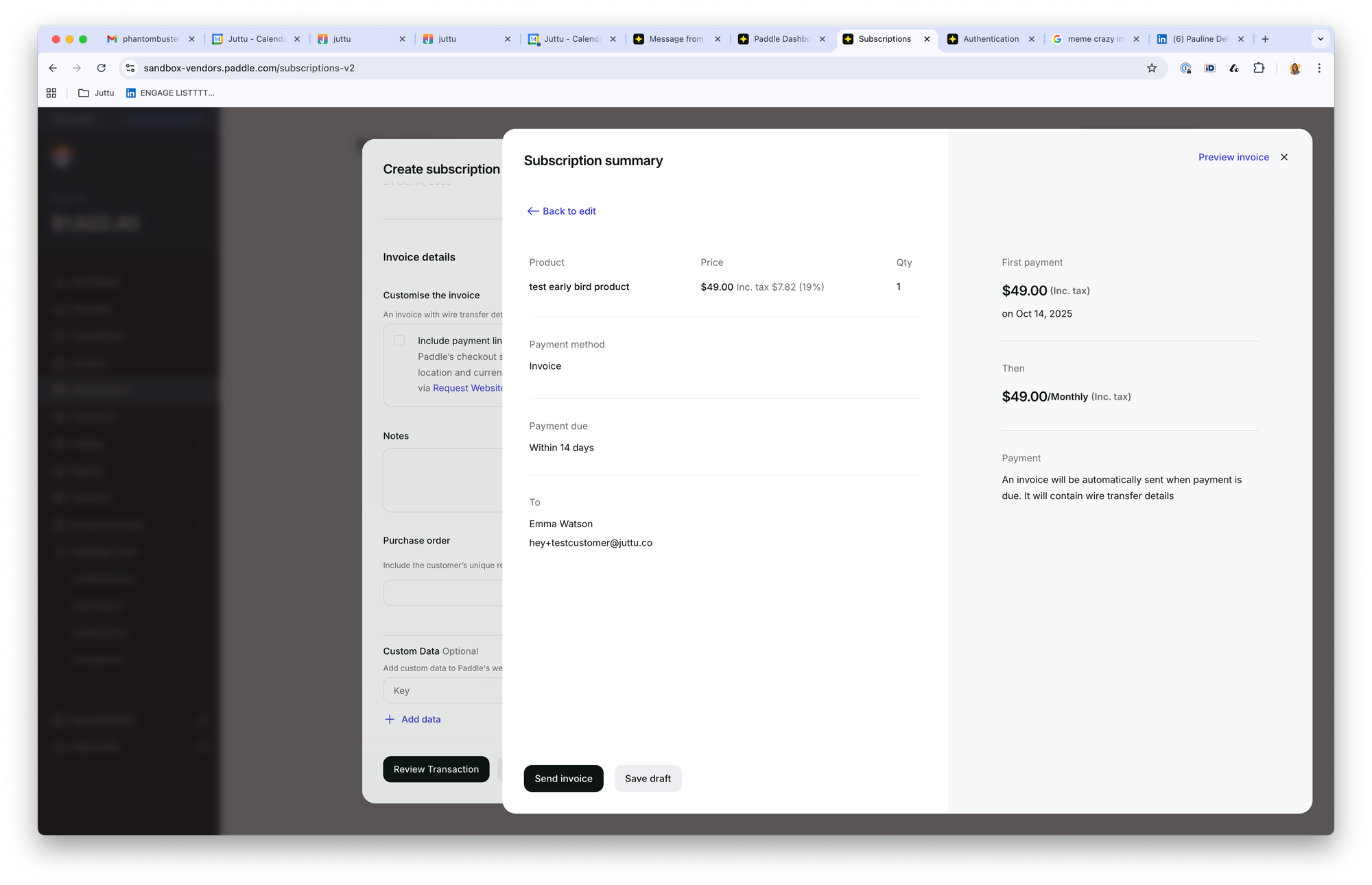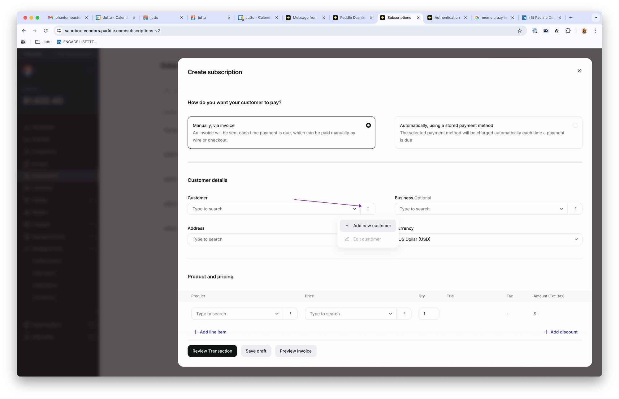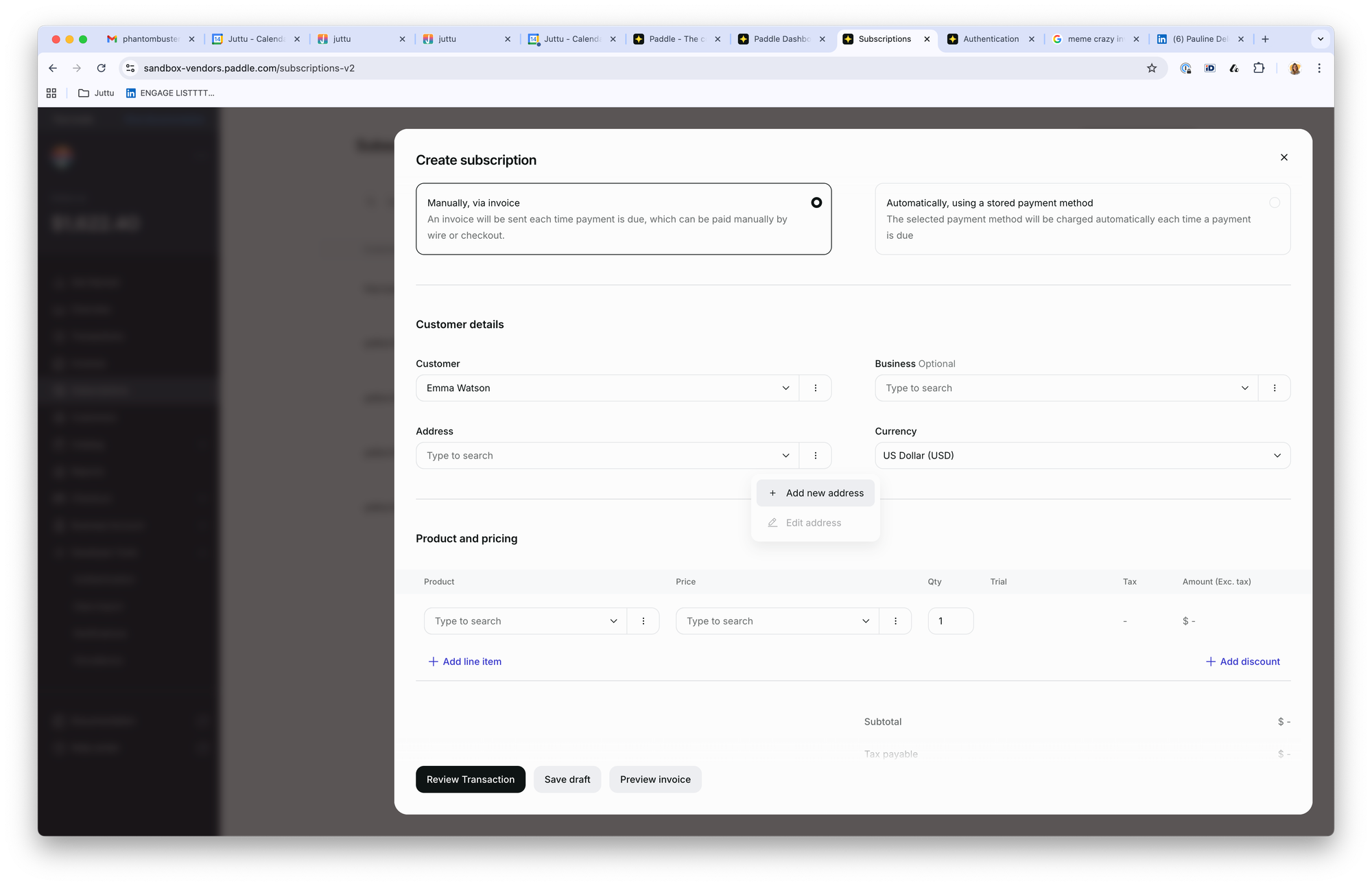 Create a Test Customer and Subscription in Paddle: