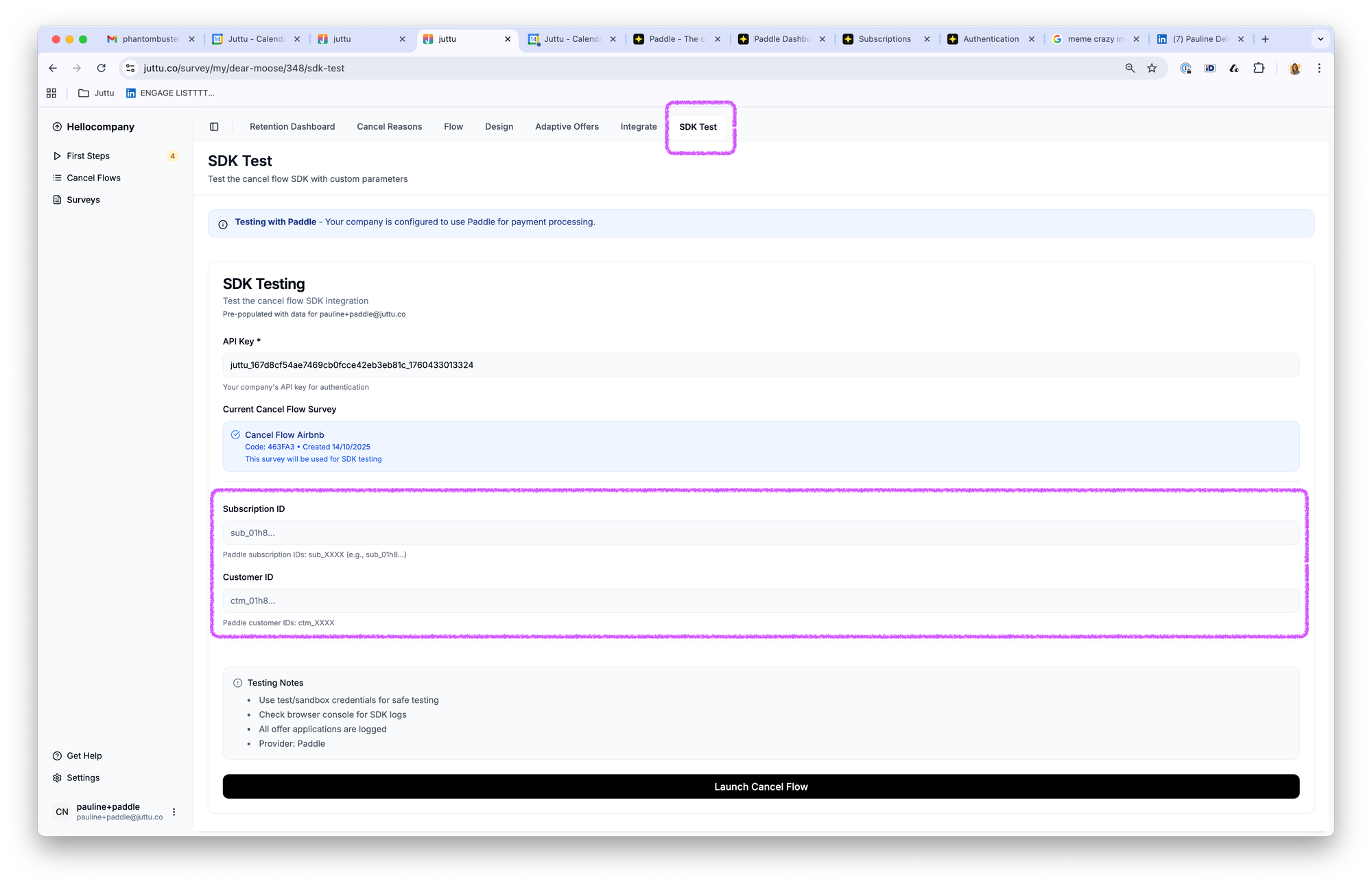 In Juttu, go to the SDK Test tab in your cancel flow.