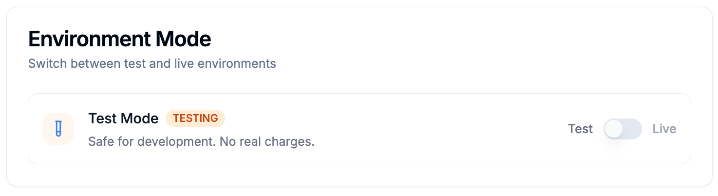 - Set the environment mode to “Test”. This will allow you to test the cancel flow in the Sandbox environment without needing to set up the SDK or frontend first.