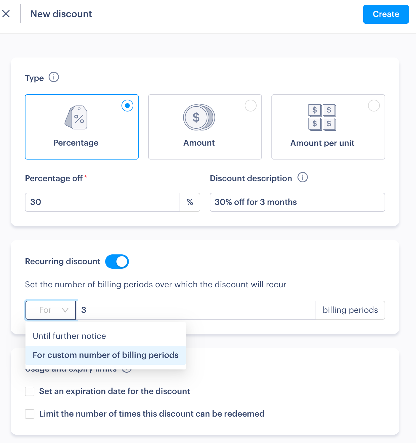 - Create a New discount (add percentage, description and the number of billing periods the discount will recur. E.g 3 periods aka 3 months.)